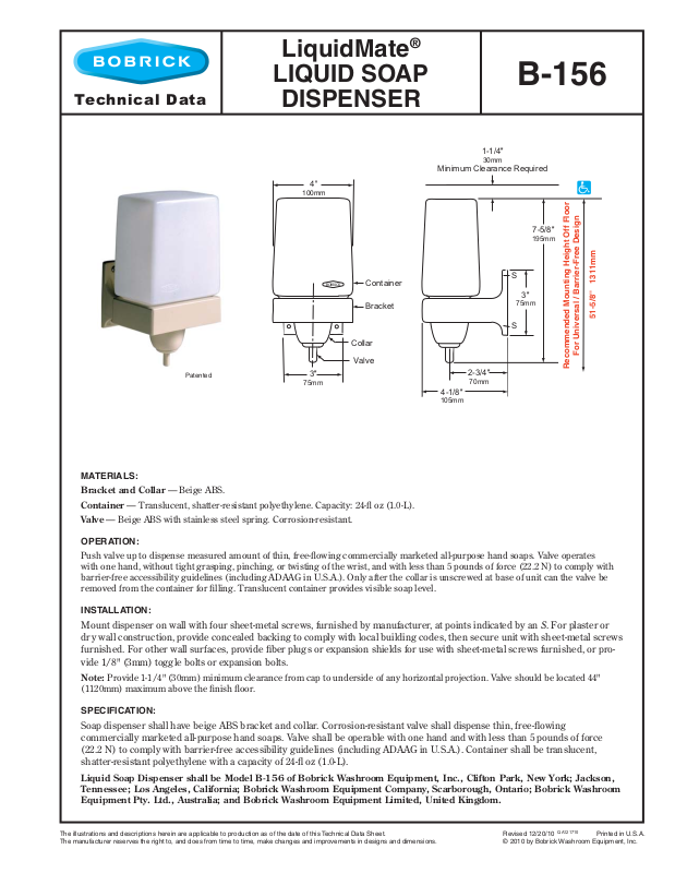 The manufacturer reserves the right to, and does from time to time, make changes and improvements in designs and dimensions. © 2010 by Bobrick Washroom Equipment, Inc.