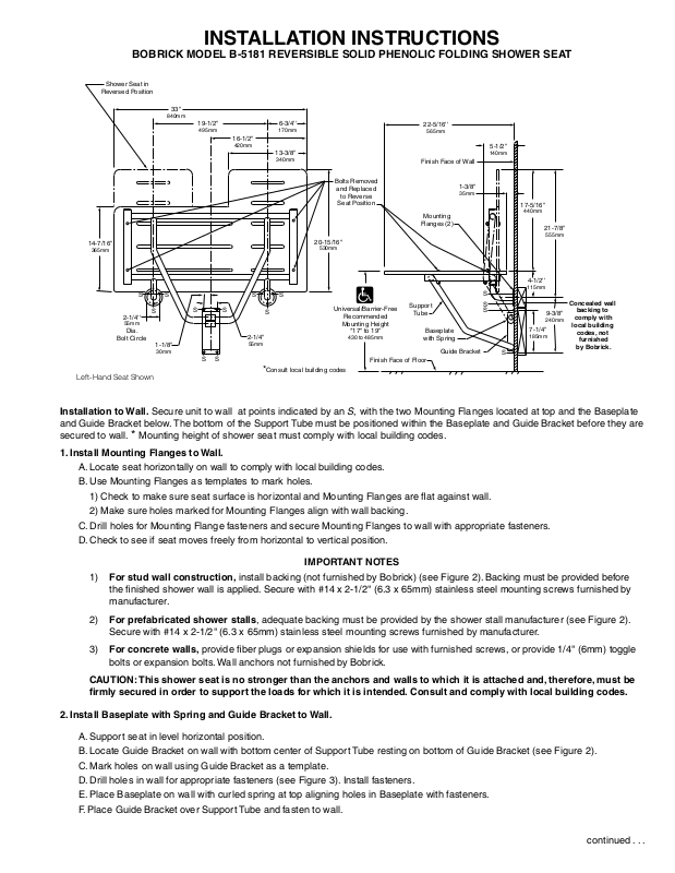 CAUTION: This shower seat is no stronger than the anchors and walls to which it is attached and, therefore, must be