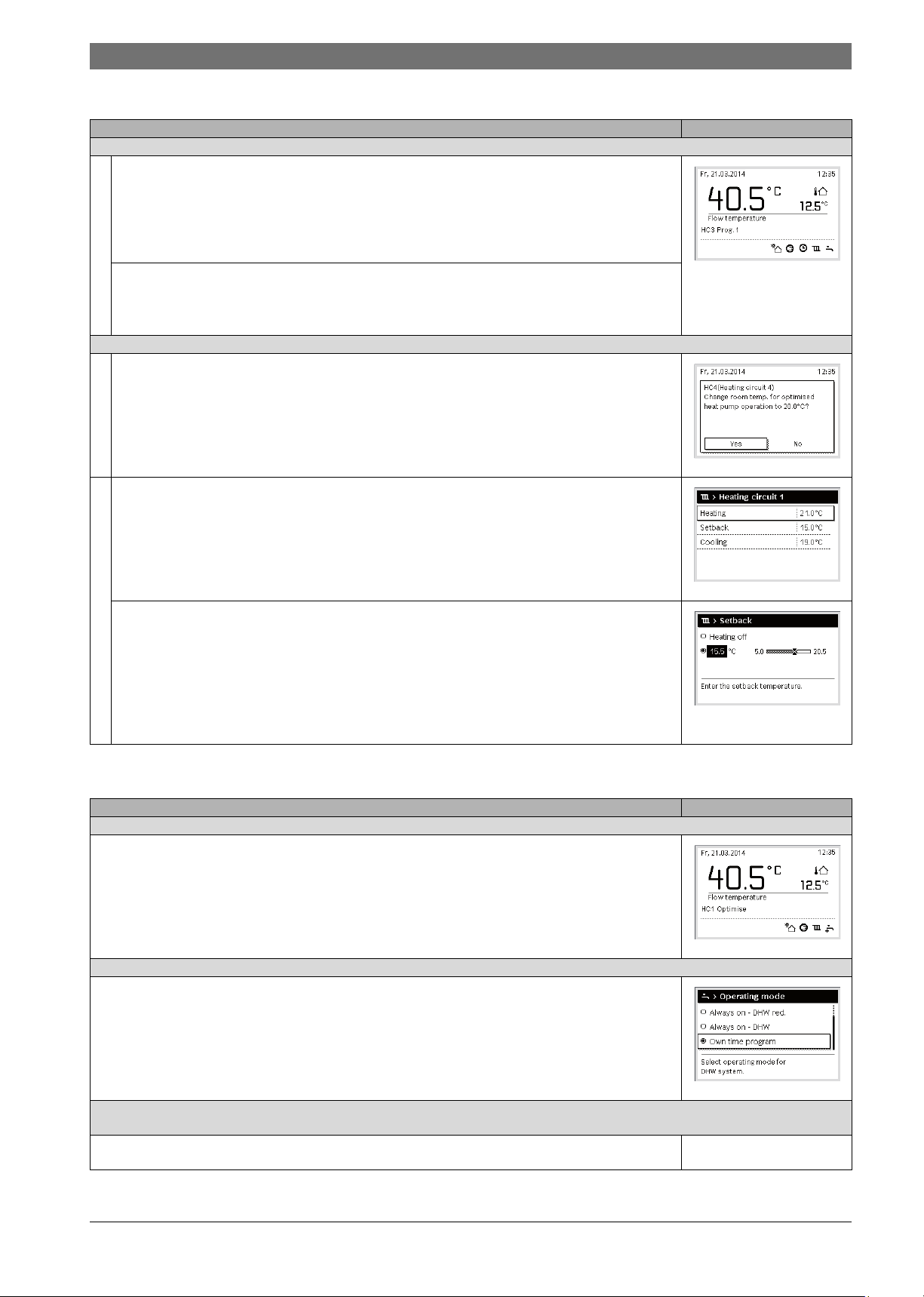 different settings for the heating, cooling, DHW and other operations.