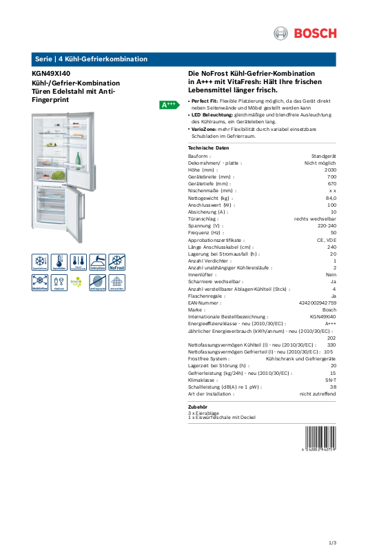 Nettofassungsvermögen Kühlteil (l) - neu (2010/30/EC) : 330
