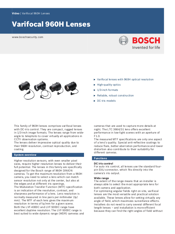 in 1/3‑inch image formats. The lenses range from wideangle to telephoto to cover virtually all applications in