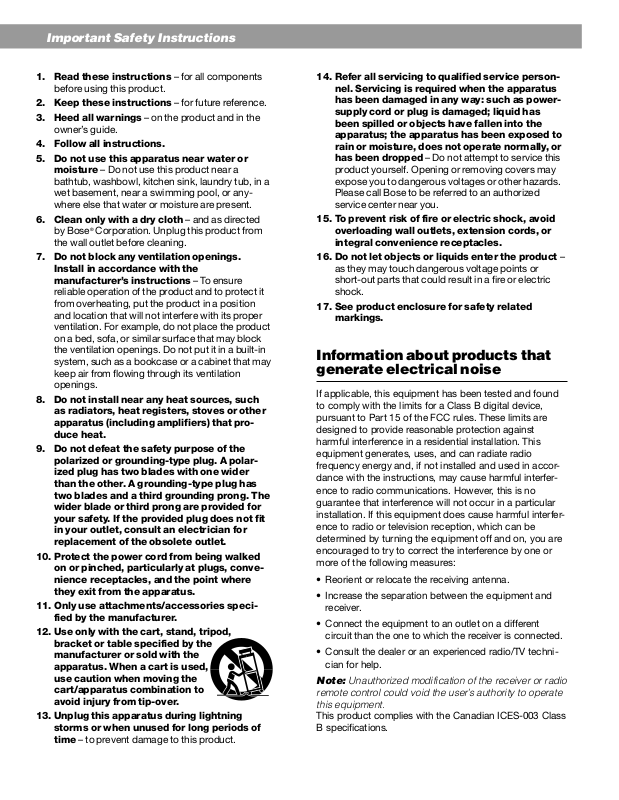 14. Refer all servicing to qualified service personnel. Servicing is required when the apparatus