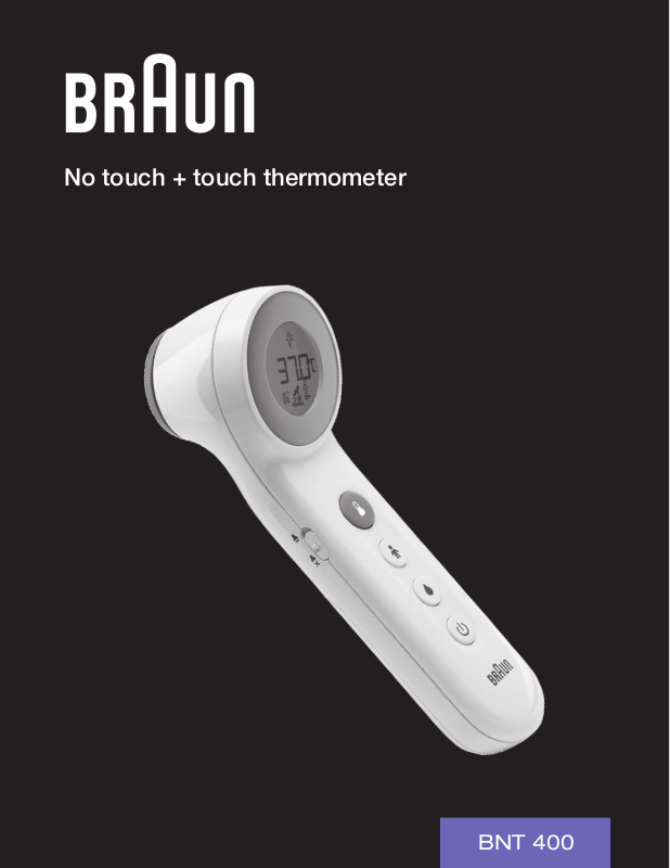 Thank you for purchasing the No touch + touch thermometer (BNT400). This thermometer is a highquality product incorporating the latest technology and tested in accordance with international standards. With its unique technology, the product can provide a stable, accurate reading with each measurement. The thermometer performs a self-test every time it is switched on to always guarantee the accuracy of measurements. The Braun No touch + touch thermometer is intended for the intermittent determination of human body temperature on people of all ages in a "Touch" and "No Touch" mode, using the center of the forehead as the measurement site. in a home use environment.