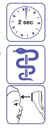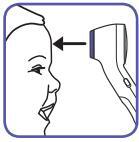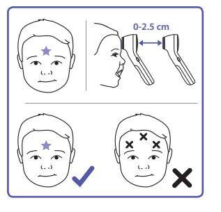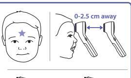 Position thermometer on or up to 2.5 cm away from the center of the forehead, just between the eyebrows.