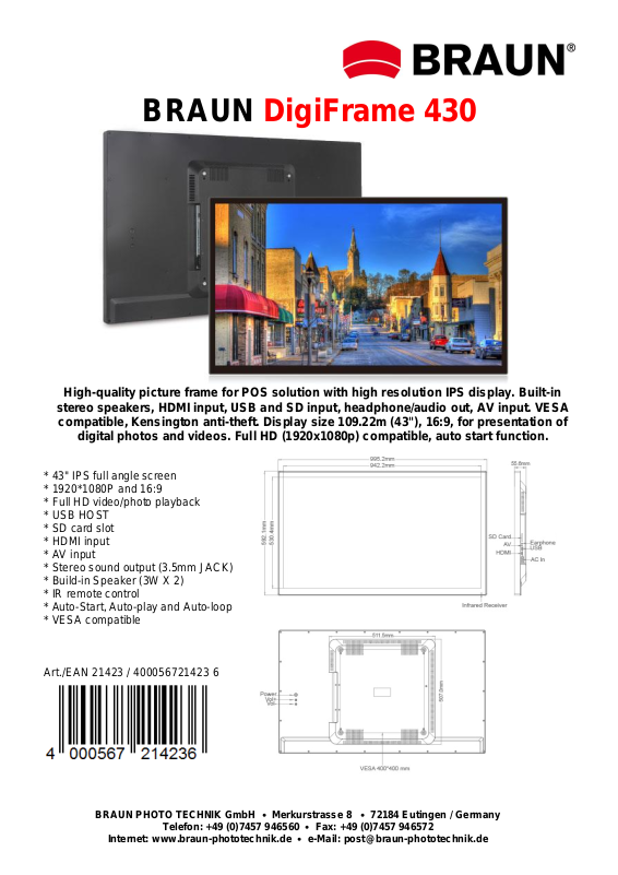 compatible, Kensington anti-theft. Display size 109.22m (43"), 16:9, for presentation of