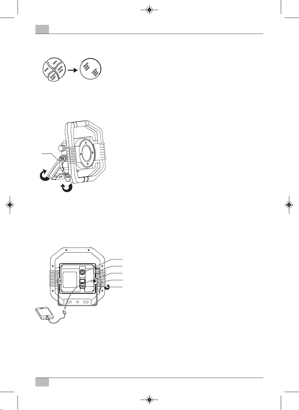 Dazu den seitlichen Schnellspanner E lösen, den Strahlerkopf in die gewünschte Position drehen und den Schnellspanner E wieder festziehen.