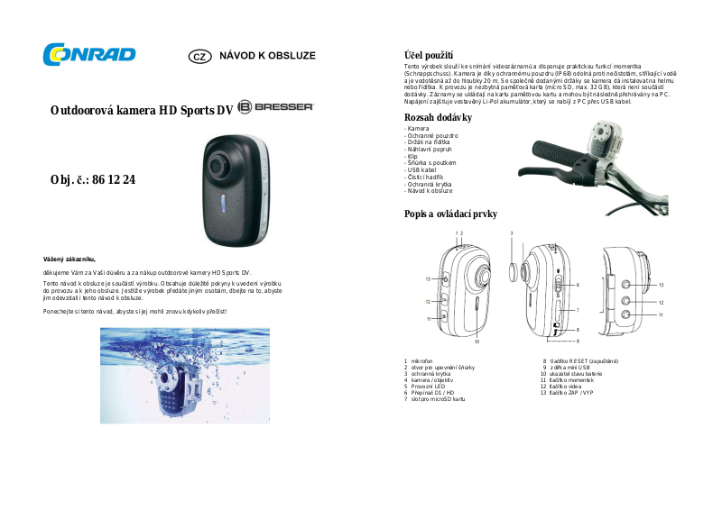 a je vodotěsná až do hloubky 20 m. Se společně dodanými držáky se kamera dá instalovat na helmu