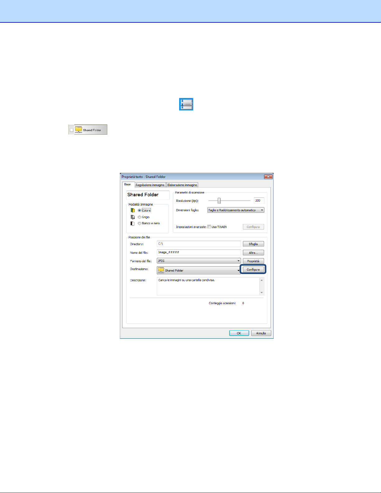 Usare Button Manager V2 per acquisire e caricare le immagini acquisite su vari file server di