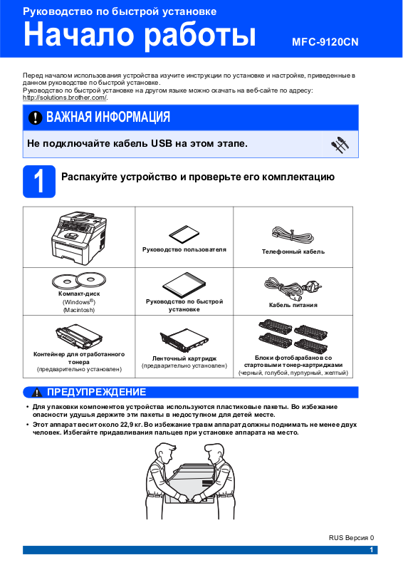 • Неподключайте кабель USB на этом этапе. Подключение соединительного кабеля выполняется наэтапеустановкипрограммы MFL-Pro.