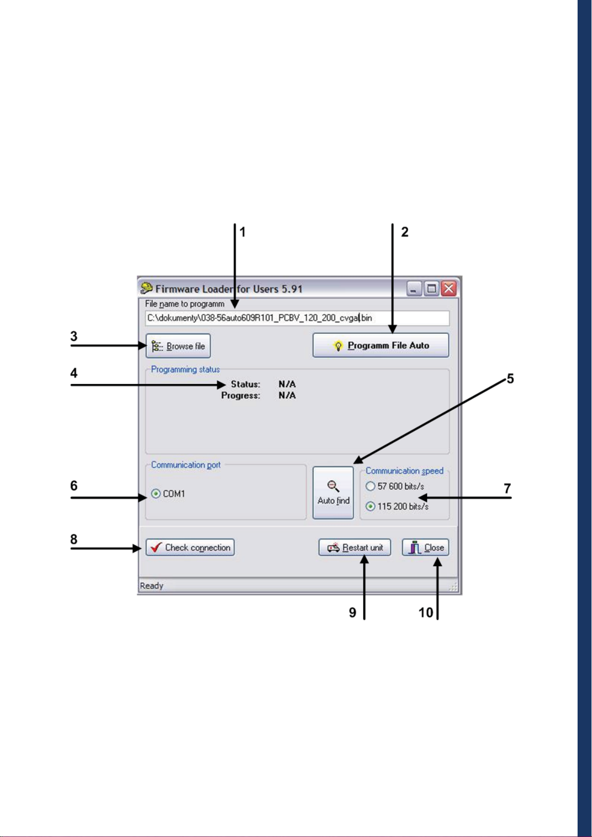 Press the button with a directory tree symbol to select the file with the application to be loaded to the device (30056autoXXX_C.bin or 300-56autoXXX_BW.bin). The selected file is displayed in the upper field. The program