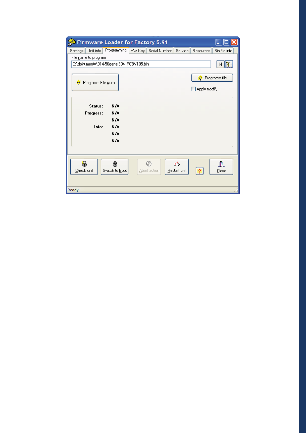If the information in the Unit info is correct it is possible to start loading of firmware. Switch to the "Programming"