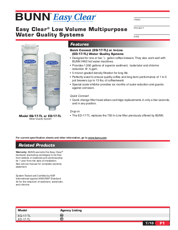 • The ED-17-TL replaces the 750 In-Line filter previously offered by BUNN.