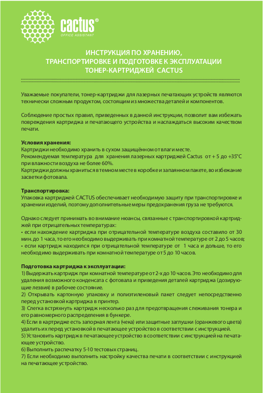 Картриджи необходимо хранить в сухом защищённом от влаги месте. Рекомендуемая температура для хранения лазерных картриджей Cactus от + 5 до +35°С при влажности воздуха не более 60%. Картриджи должны хранитьс я в темном месте в коробке и запаянном пакете, во избежание засветки фотовала.