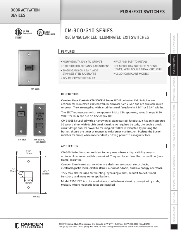 Camden Door Controls CM-300/310 Series Illuminated Exit Switches.