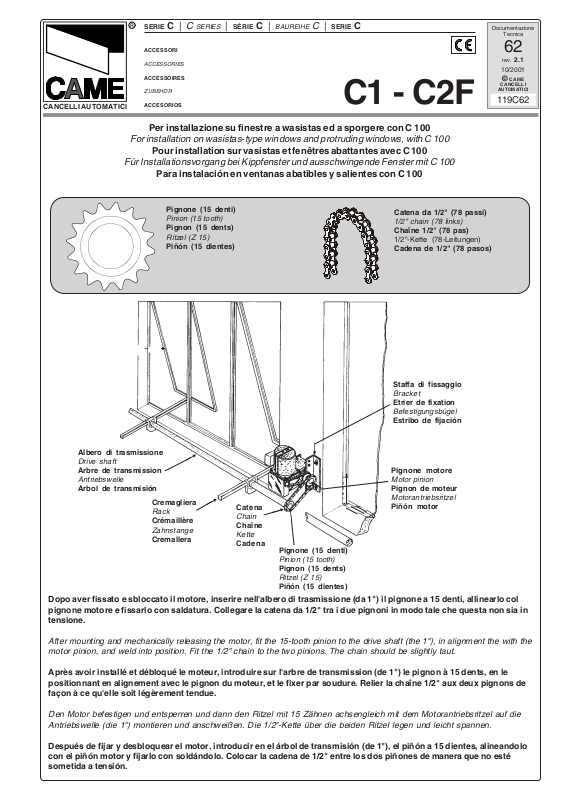 Après avoir installé et débloqué le moteur, introduire sur l'arbre de transmission (de 1") le pignon à 15 dents, en le positionnant en alignement avec le pignon du moteur, et le fixer par soudure. Relier la chaîne 1/2" aux deux pignons de façon à ce qu'elle soit légèrement tendue.