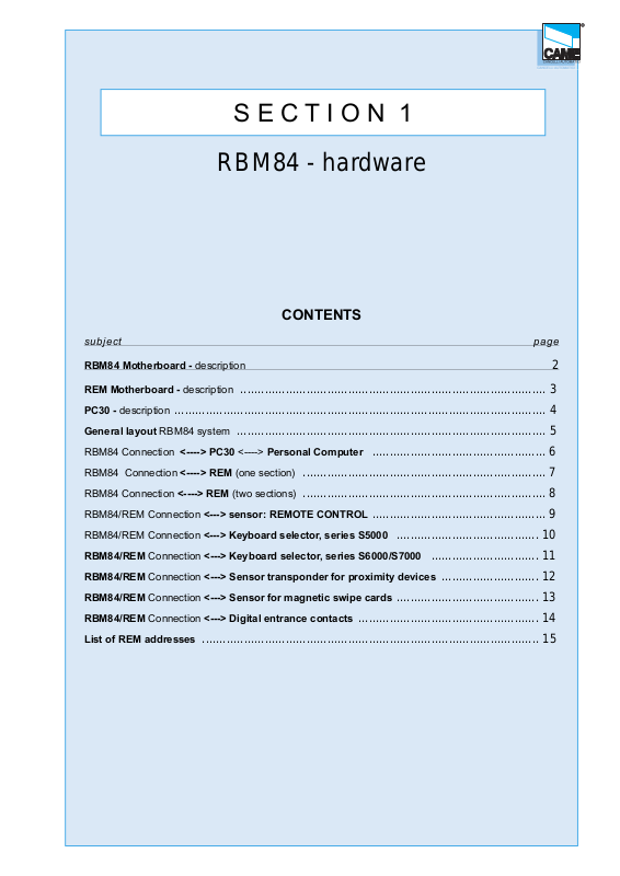 RBM84/REM Connection <---> Sensor transponder for proximity devices ............................ 12