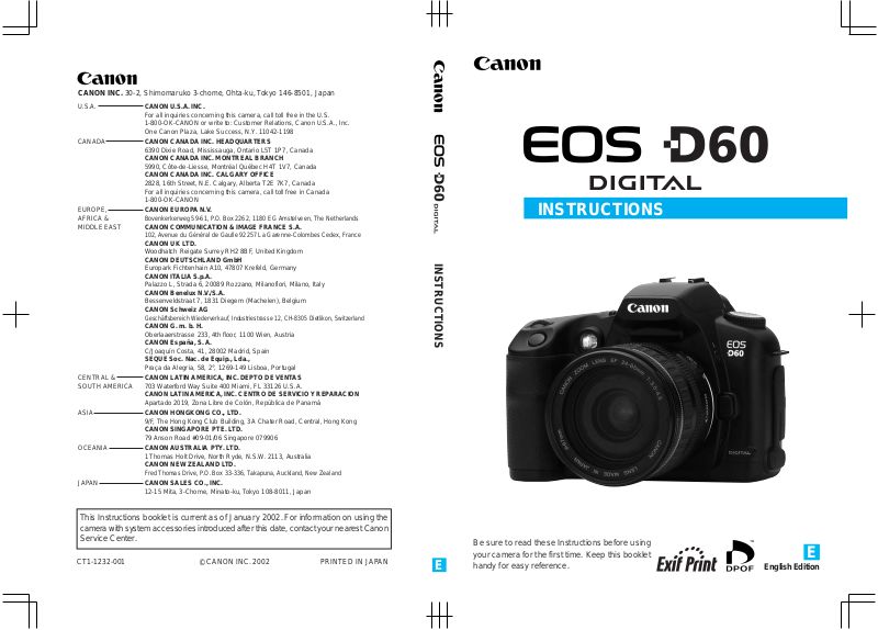The EOS D60 digital camera is a high-performance, single-lens reflex AF camera with an ultrafine CMOS sensor having approx. 6.3 million effective pixels. The camera is compatible with all