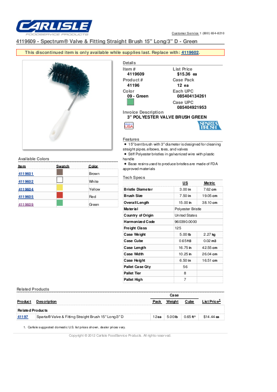 4119609 - Spectrum® Valve & Fitting Straight Brush 15" Long/3" D - Green