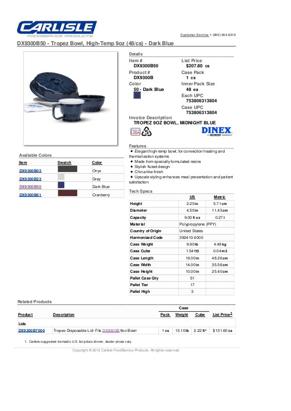 DX9300B7000 Tropez Disposable Lid- Fits DX9300B 9oz Bowl 1 cs 13.10 lb 2.22 ft³ $131.60 cs