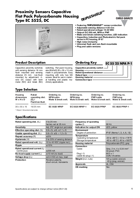 dimensions operating dist. NPN/cable NPN/plug PNP/cable PNP/plug