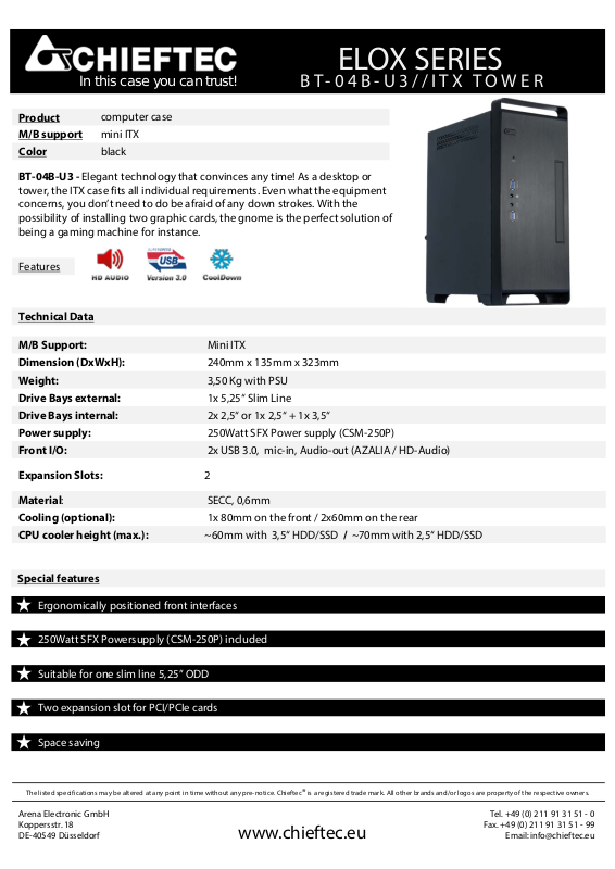 The listed specifications may be altered at any point in time without any pre-notice. Chieftec® is a registered trade mark. All other brands and/or logos are property of the respective owners.