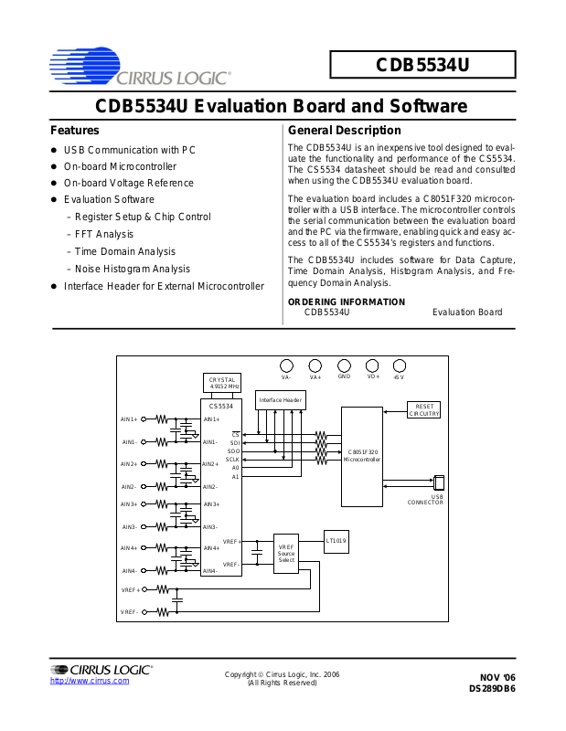 The CDB5534U is an inexpensive tool designed to evaluate the functionality and performance of the CS5534.