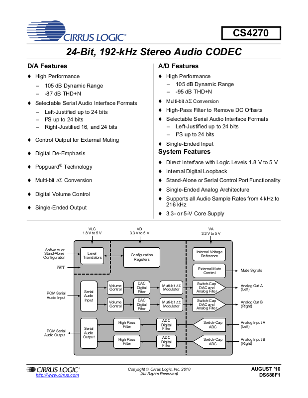 Integrated level translators allow easy interfacing between the CS4270 and other devices operating over a