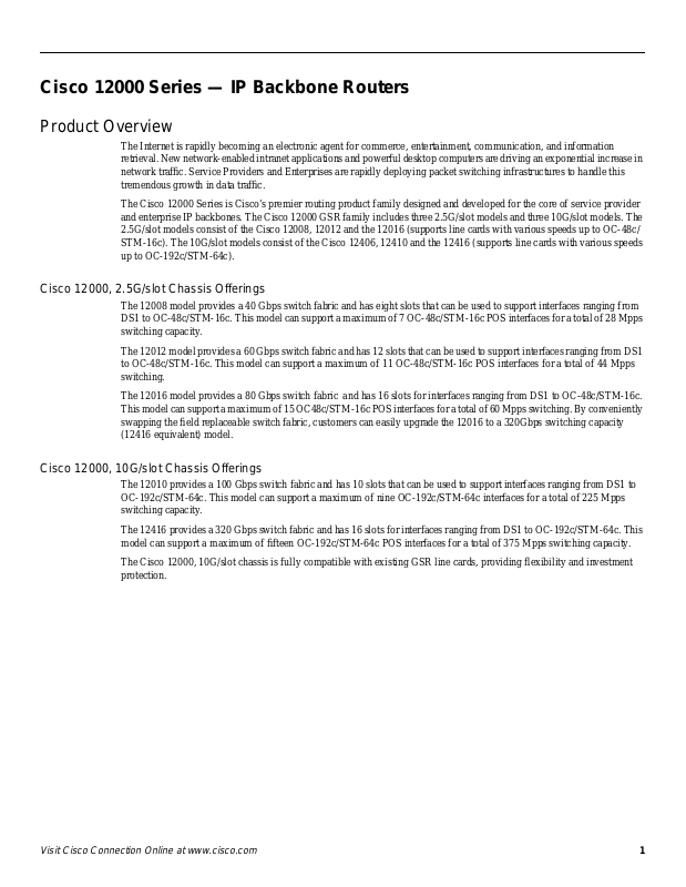and enterprise IP backbones. The Cisco 12000 GSR family includes three 2.5G/slot models and three 10G/slot models. The