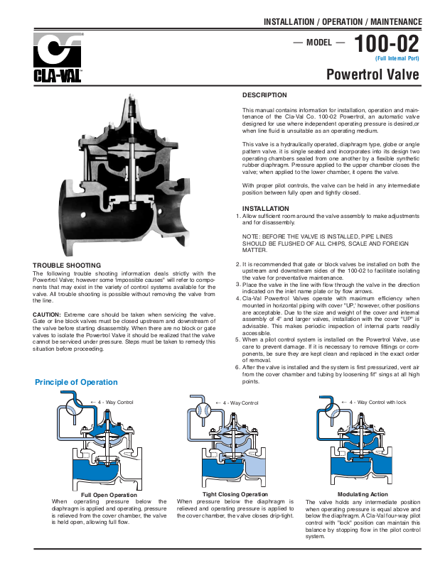 This manual contains information for installation, operation and maintenance of the Cla-Val Co. 100-02 Powertrol, an automatic valve