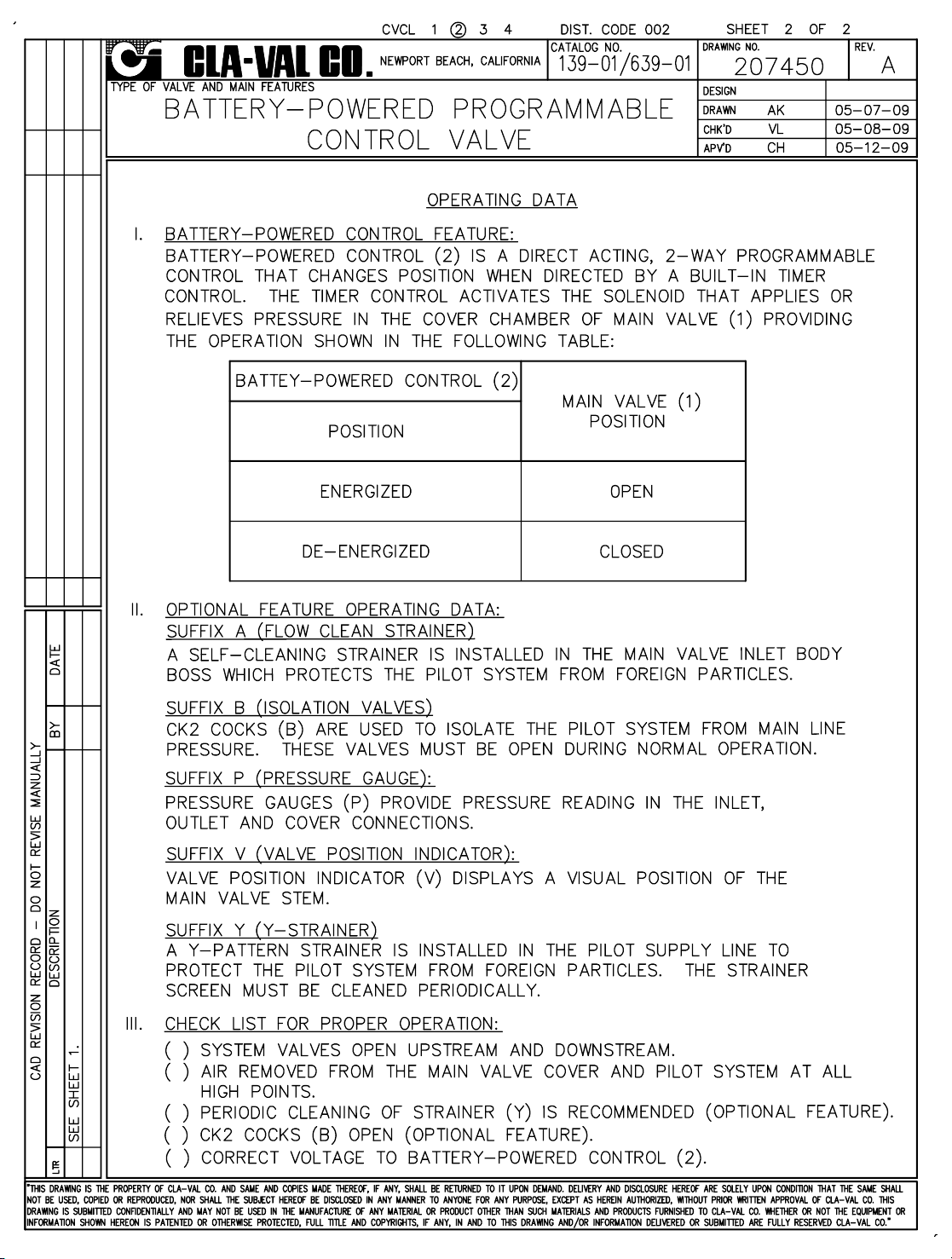 The Cla-Val Model 139-01/639-01 Programmable Timer Control Valve is an on-off control valve for applications using a program­mable time schedule. Using the CTC Electronic Timer Control up to four opening and closing times per day can be set for a weekly schedule.