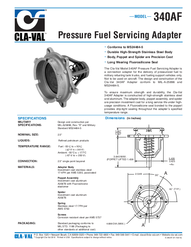 Cla-Val 340AF Adapter conform to MIL-A-25896 and