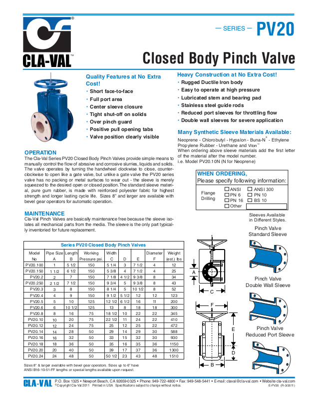 The Cla-Val Series PV20 Closed Body Pinch Valves provide simple means to