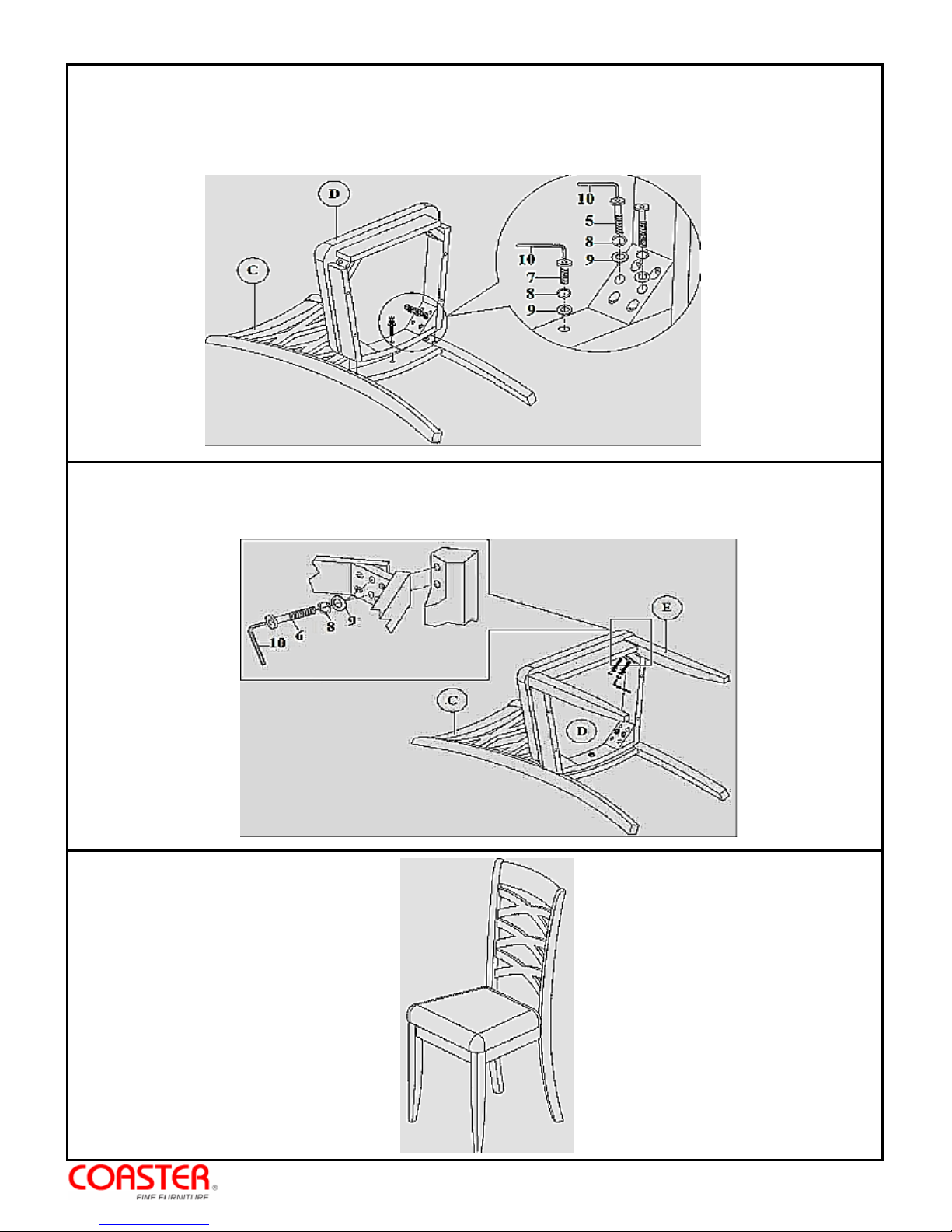 small lock washer and small flat washer. Align and hand tighten seat frame to chair back leg using long bolt,small