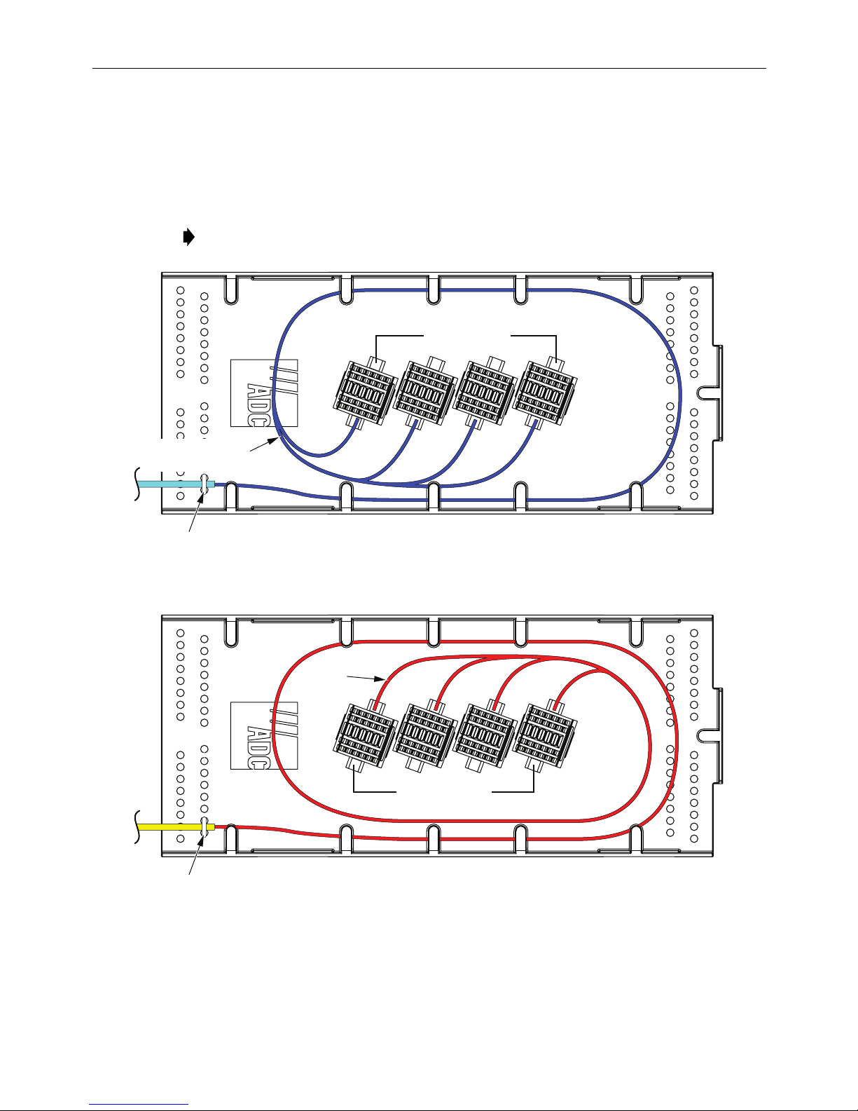 MPO trunk cable in panels with MPO adapter packs. This kit may also be used for routing