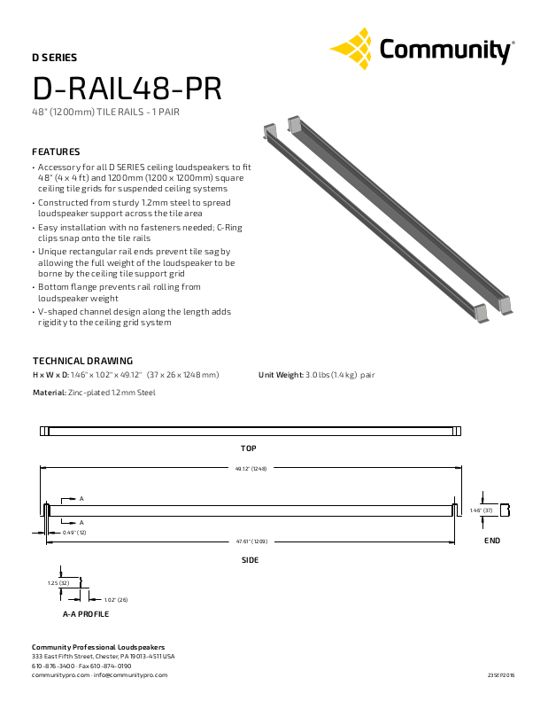 H x W x D: 1.46" x 1.02" x 49.12" (37 x 26 x 1248 mm)