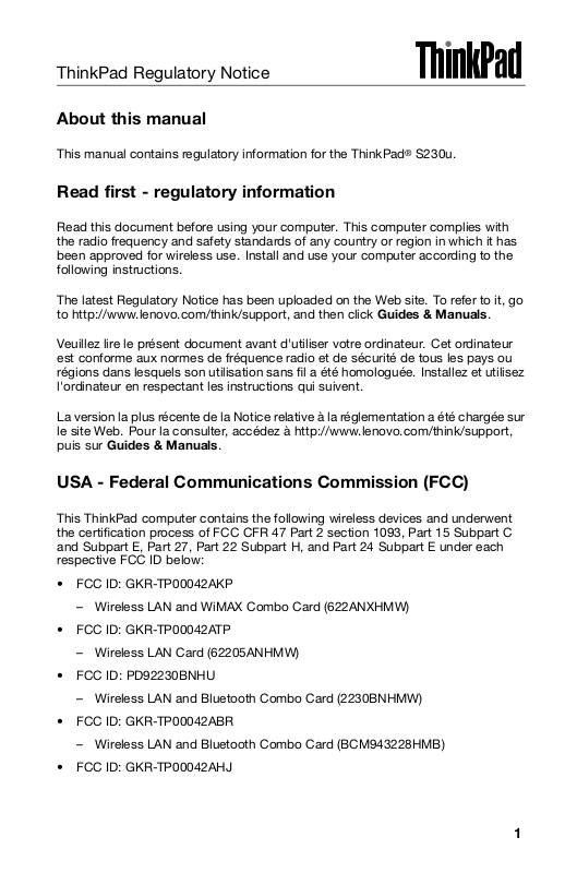 ThismanualcontainsregulatoryinformationfortheThinkPad