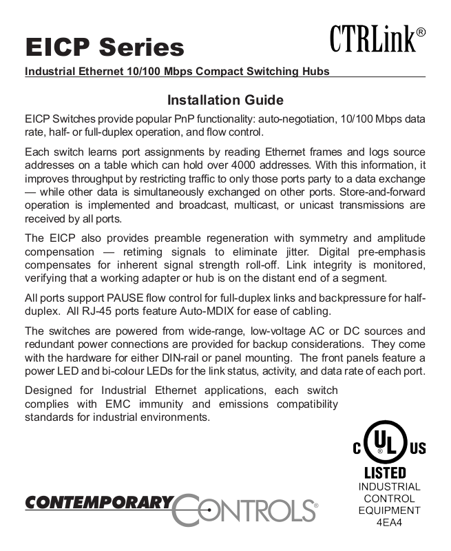 EICP Switches provide popular PnP functionality: auto-negotiation, 10/100 Mbps data