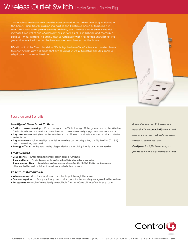 the home, immediately making it a part of the Control4® home automation system. With intelligent power-sensing abilities, the Wireless Outlet Switch enables