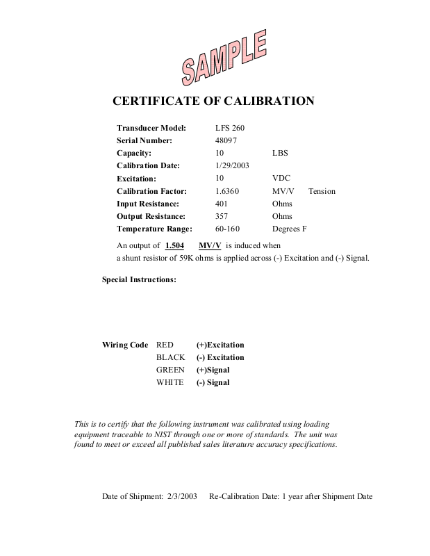 Date of Shipment: 2/3/2003 Re-Calibration Date: 1 year after Shipment Date