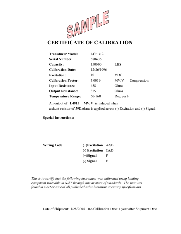 Date of Shipment: 1/28/2004 Re-Calibration Date: 1 year after Shipment Date