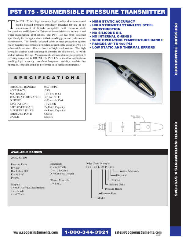 covering ranges up to 100 PSI. The PST 175 is ideal for applications