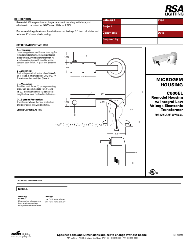 RSA Lighting • 7945 Orion Ave. • Van Nuys, CA 91406 • 818-349-3030 • FAX 818-349- 3031