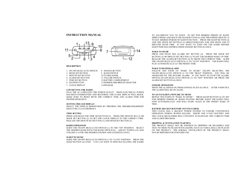1. ON-OFF-BUZZ-AUTO SWITCH 8. SNOOZE BUTTON