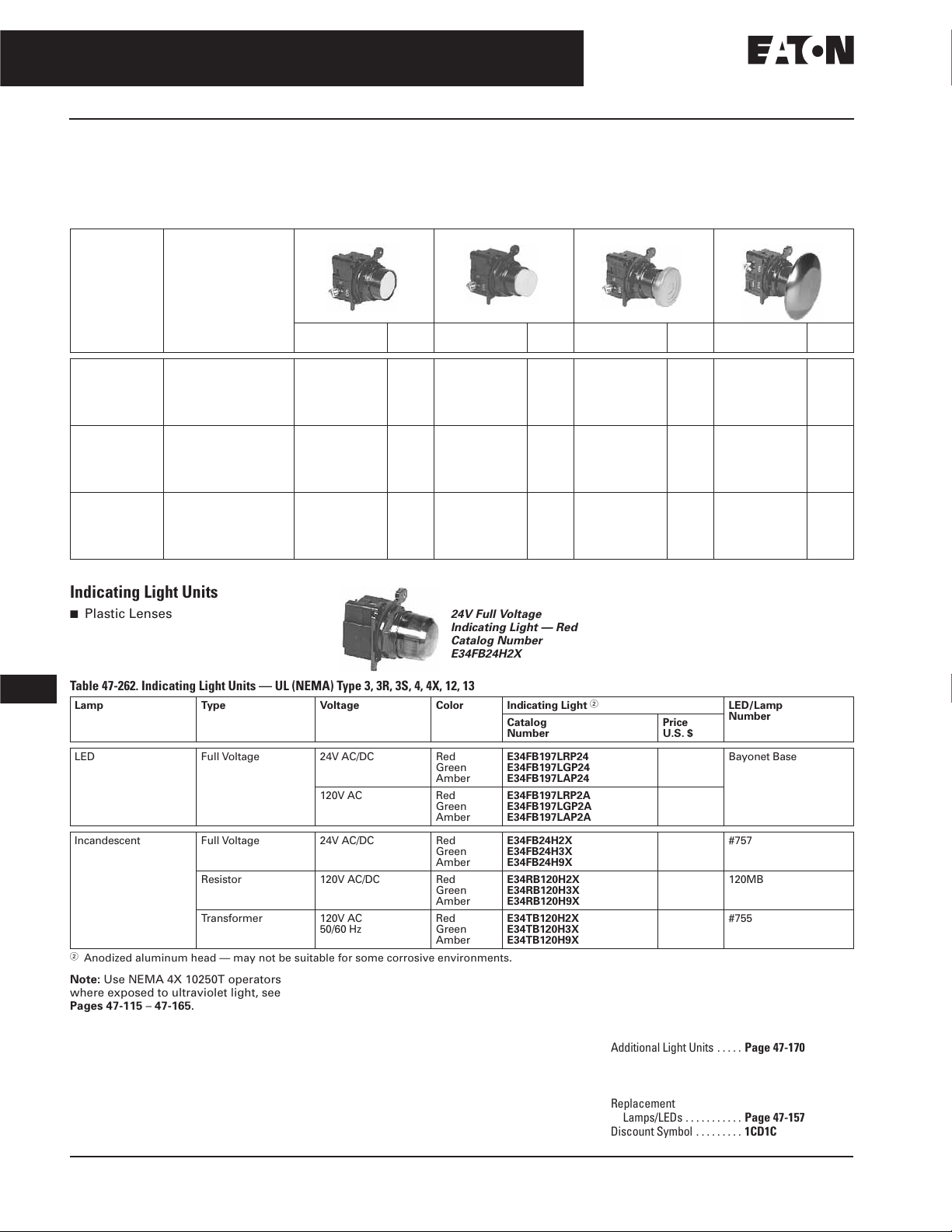 Table 47-262. Indicating Light Units — UL (NEMA) Type 3, 3R, 3S, 4, 4X, 12, 13
