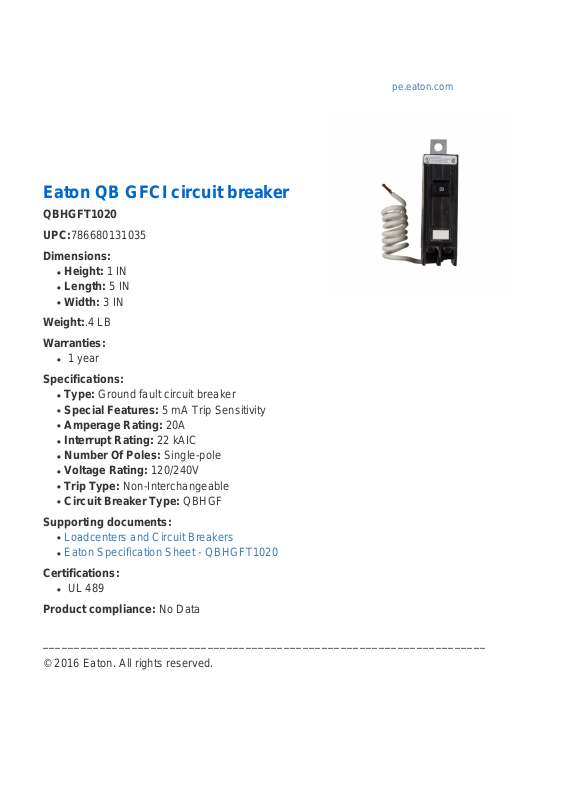 Cutler Hammer, Div of Eaton Corp QBHGFT1020 Specifications