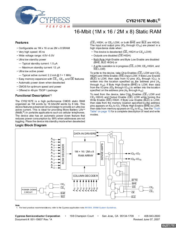 Document Title: CY62167E MoBL® 16-Mbit (1M x 16 / 2M x 8) Static RAM