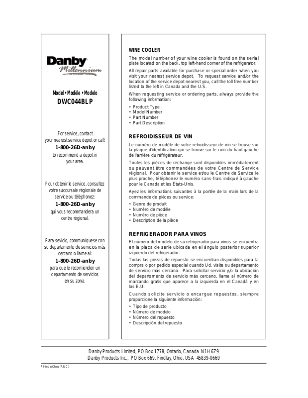 Danby Products Limited, PO Box 1778, Ontario, Canada N1H 6Z9