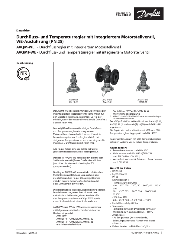 AVQMT-WE - Durchfluss- und Temperaturregler mit integriertem Motorstellventil