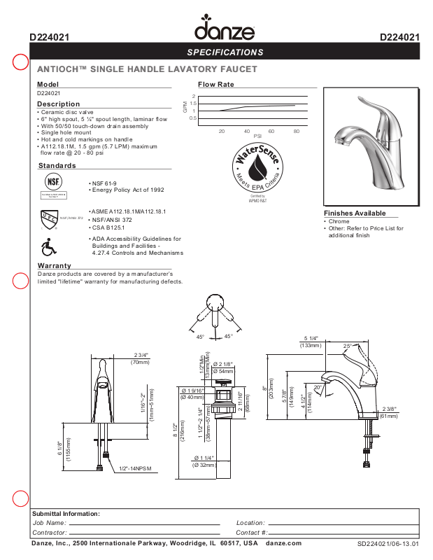 • A112.18.1M, 1.5 gpm (5.7 LPM) maximum