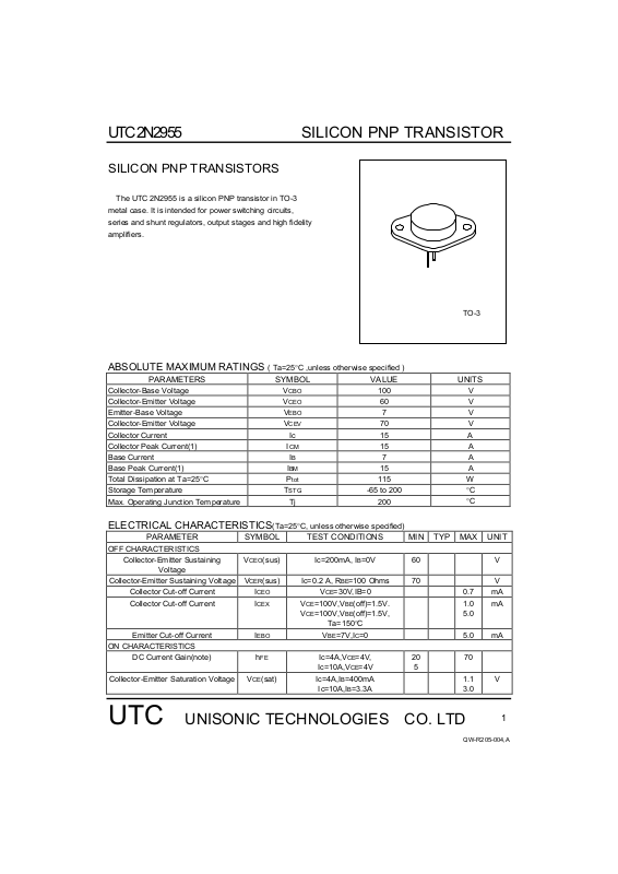 The UTC 2N2955 is a silicon PNP transistor in TO-3